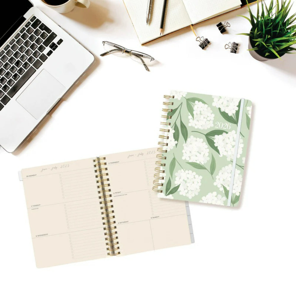 La Agenda 2026 Hydrangea Semanal Anillado A5 combina un diseño delicado con 18 meses de planificación semanal. Su tamaño A5 y encuadernación anillada facilitan la organización diaria, ayudándote a mantener tus compromisos y objetivos siempre a la vista.