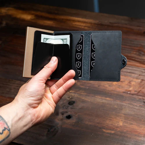- Tarjetero con deslizador incorporado con capacidad para 4-6 tarjetas, además, cuenta con bolsillos interiores para 4-6 tarjetas adicionales llegando a un total de 8-12 tarjetas por billetera. Incluye espacio para guardar múltiples billetes.