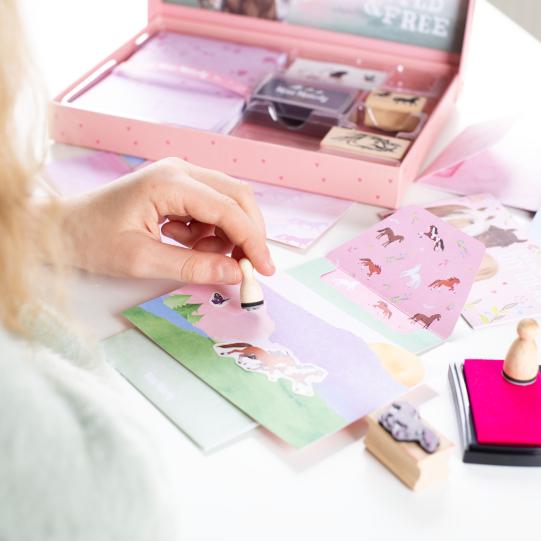 Diversión a tope con cuños de Miss Melody. Con 5 cuños de madera (caballos, corazones, estrellas), dos 2 almohadillas de tinta (rosa fuerte, lila), cuatro hojas de pegatinas, 12 tarjetas monocolor, 12 tarjetas ilustradas y 12 sobres a juego para crear obras de arte en torno a los caballos. Para regalar y enviar. Se incluye un librito con ejemplos creativos muy fáciles de seguir.