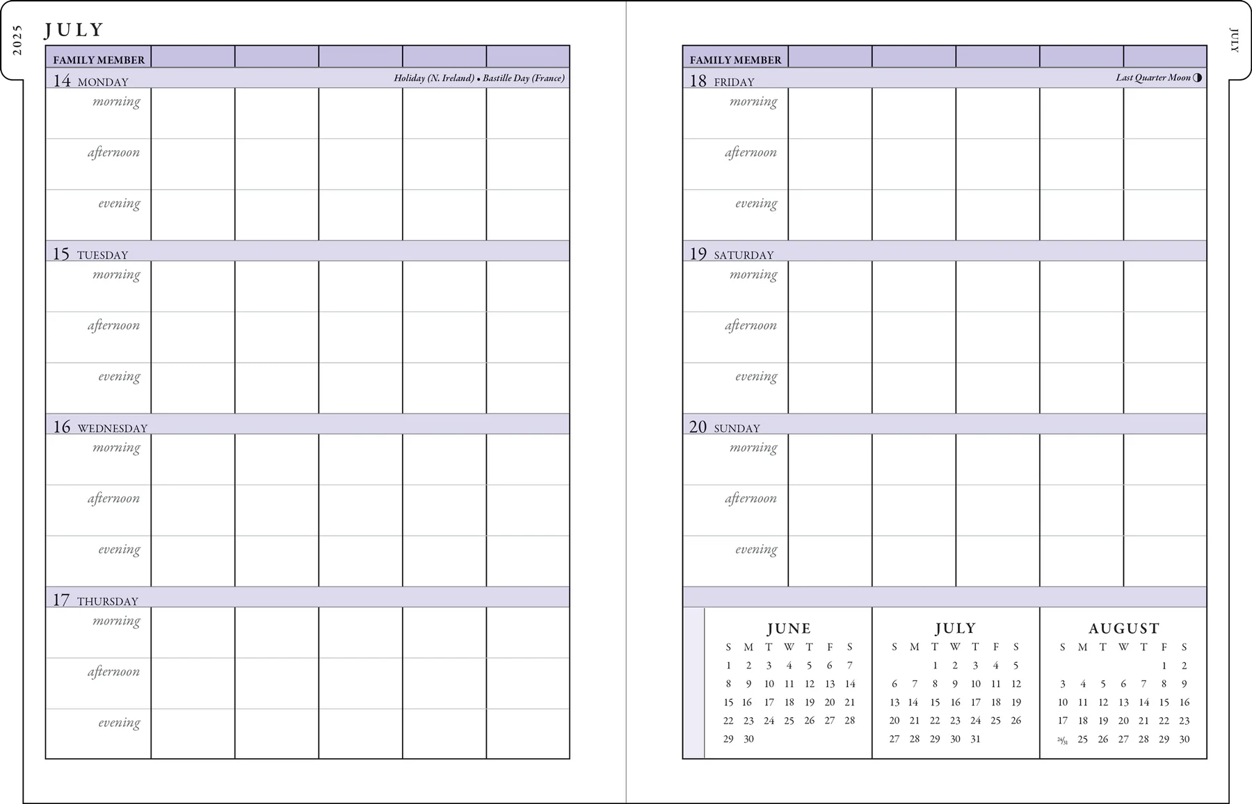 - Cada doble página muestra una columna para cada uno de los 5 miembros de la familia.