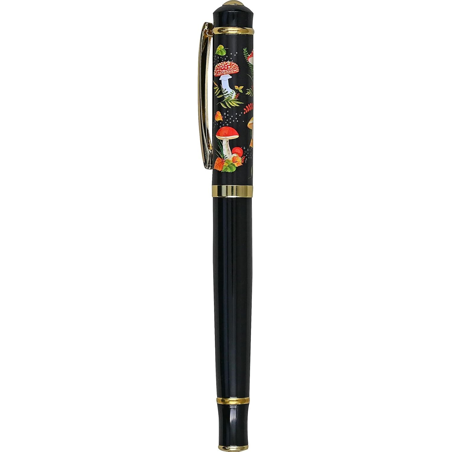 - El encantador diseño de la pluma, con hongos, hojas y helechos sobre un fondo negro, infundirá un toque de fantasía en tus momentos de escritura.