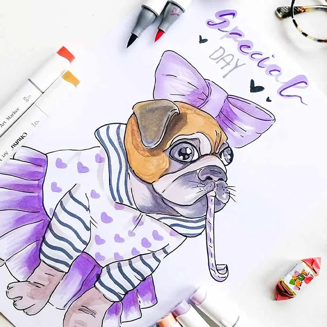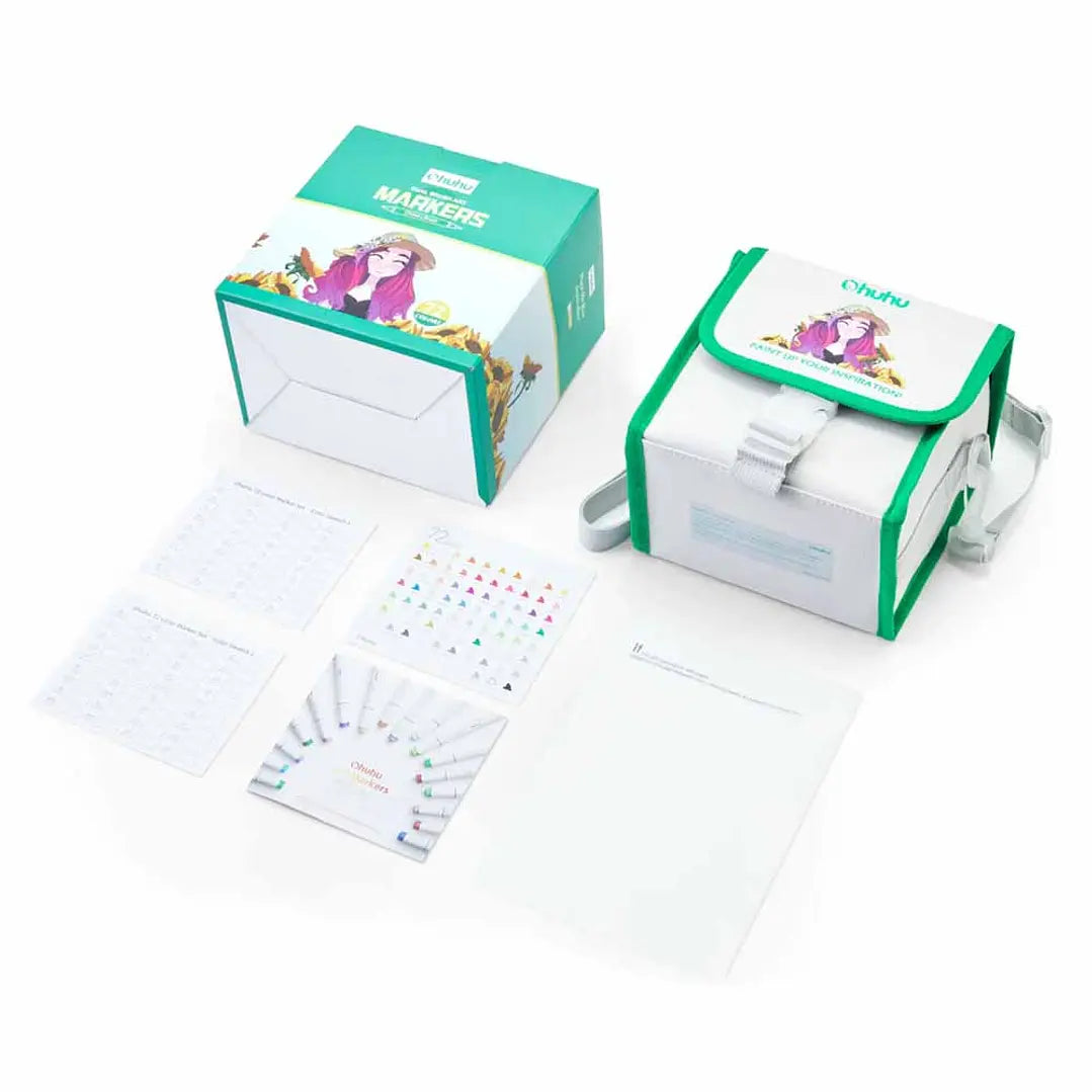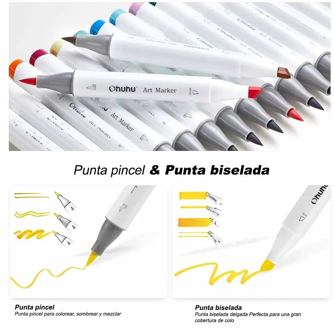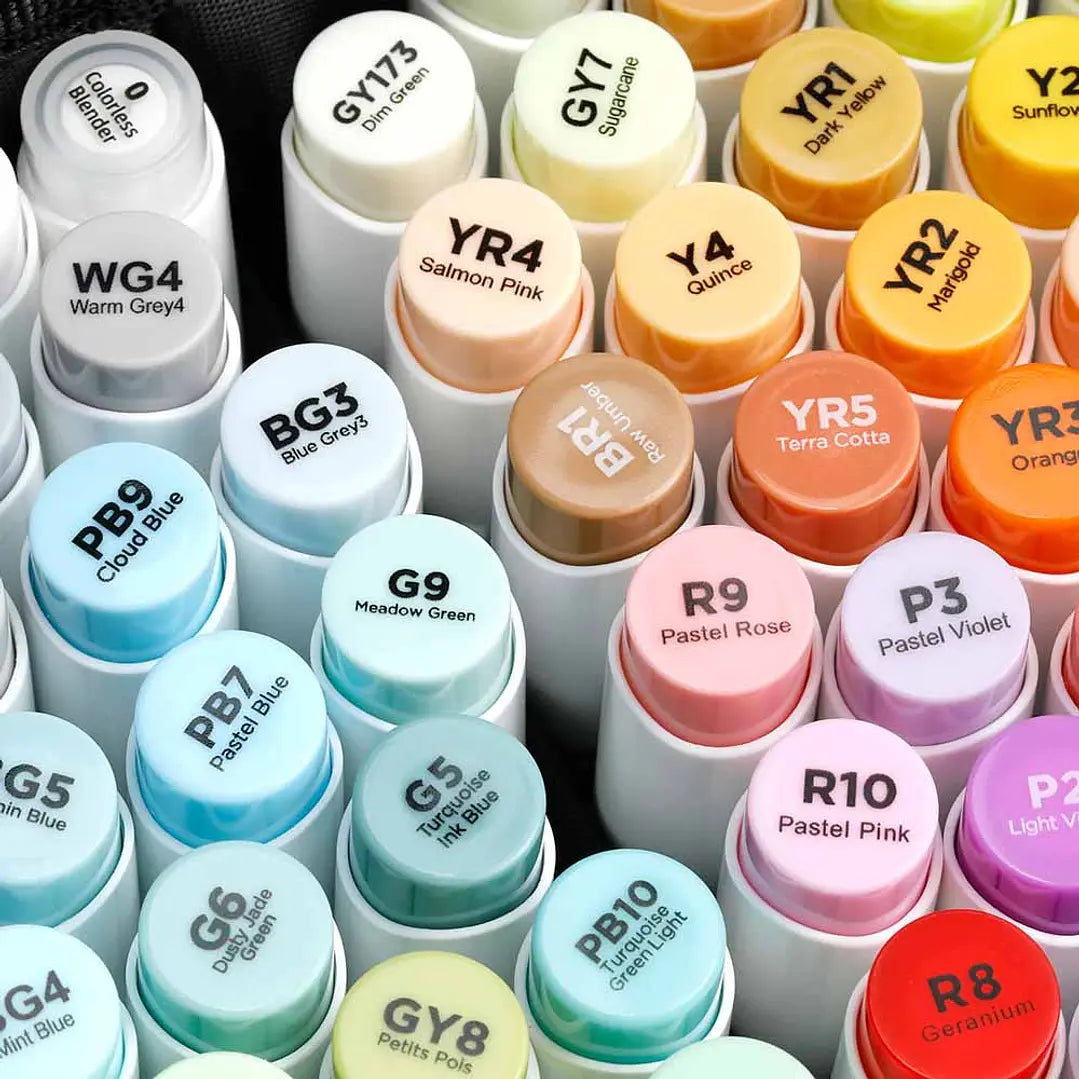 Set de marcadores permanentes a base de alcohol con doble punta. Vienen 72 hermosos y vibrantes colores dentro de su estuche, además de un lápiz blender para difuminar o mezclar y una lámina protectora para no manchar las hojas de tu sketchbook.
