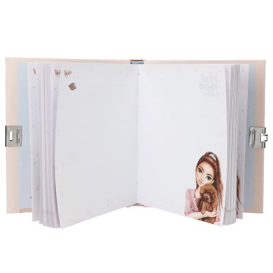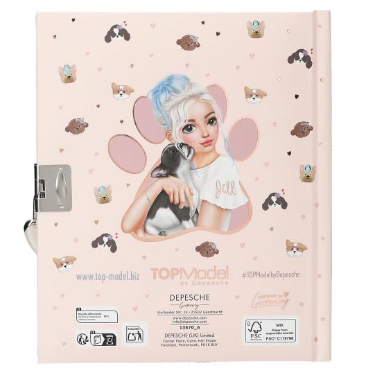 Para secretos y deseos. El diario de TOPModel Doggy, con candado de corazón, diseño de una modelo y muchos perritos monísimos, tiene 192 páginas con pauta de línea fina y preciosas ilustraciones de perros.