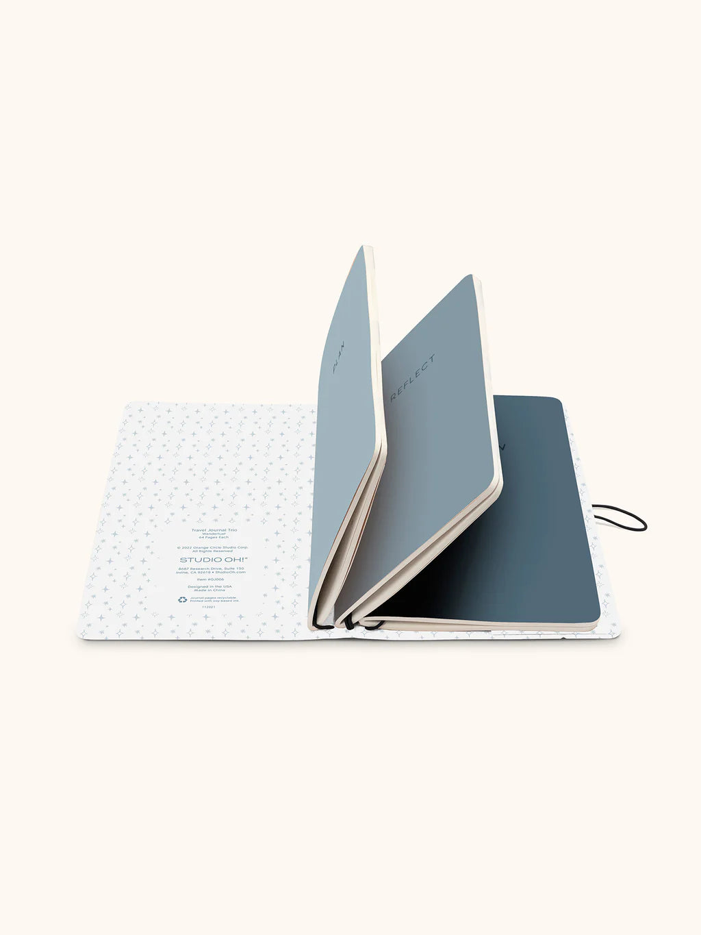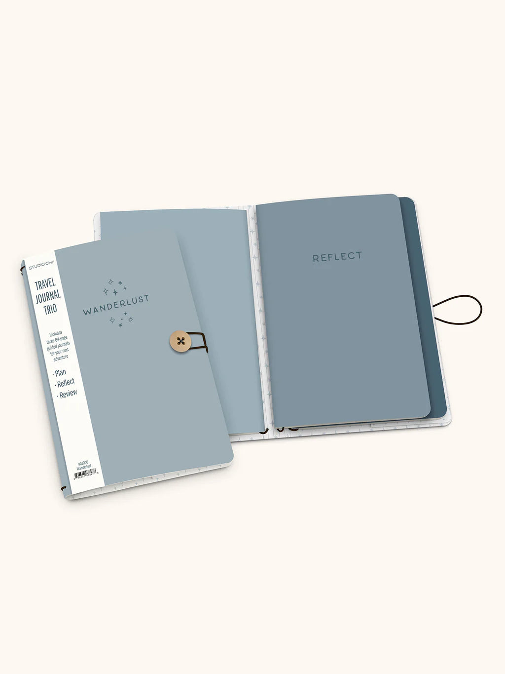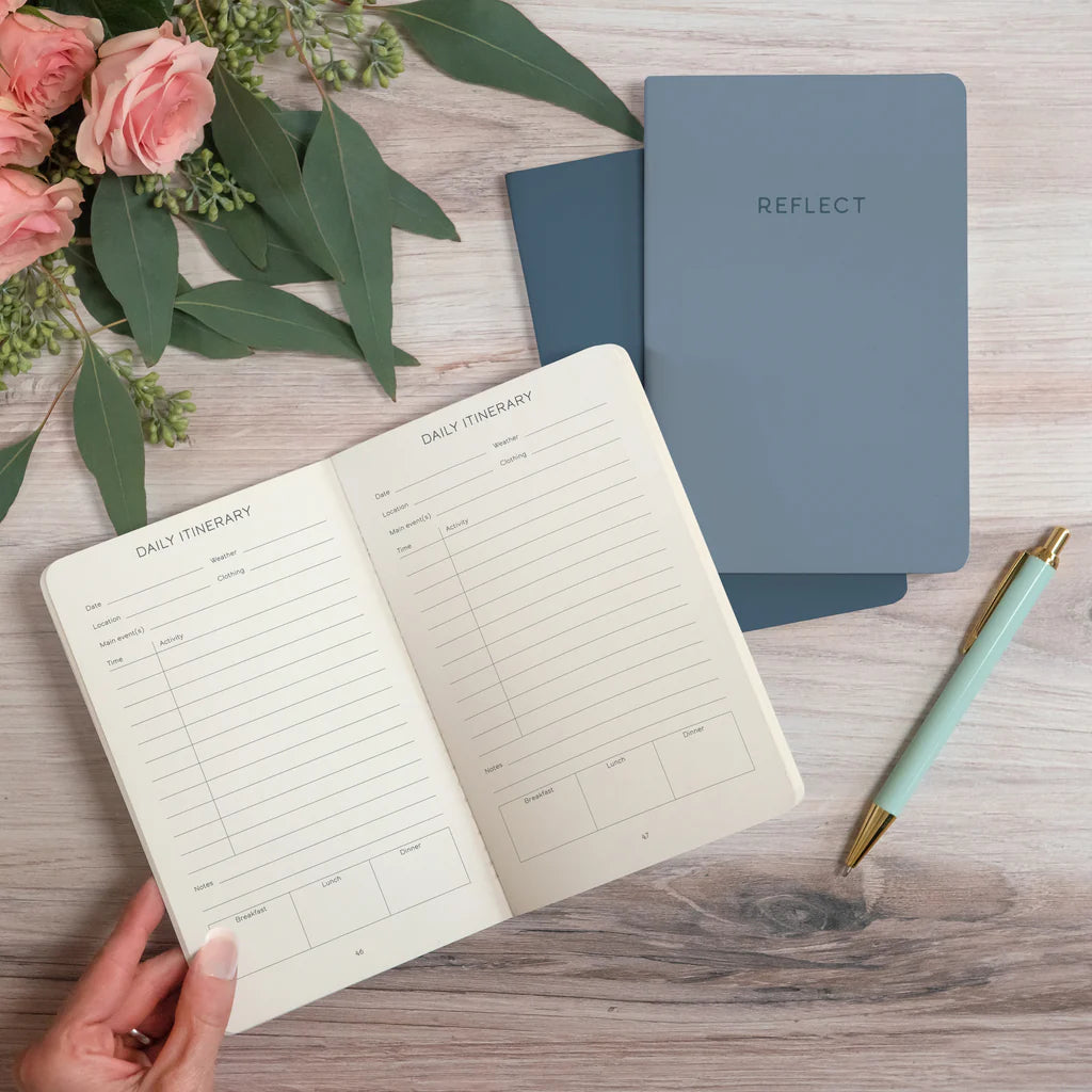 El Trío de Diarios de Viaje de Studio Oh! está diseñado para servir como planificador y recuerdo para los amantes de los viajes. El paquete incluye tres diarios del tamaño perfecto para llevar en el bolso o la mochila durante un día de exploración. «Plan» incluye herramientas de organización como un presupuesto de viaje, espacio para anotar los detalles de transporte y alojamiento, e itinerarios diarios detallados. «Reflexiona» incluye líneas en blanco para entradas de diario y reflexiones libres. «Reseña» ofrece sugerencias para calificar y registrar experiencias con restaurantes, alojamientos, actividades y más, además de espacio para guardar fotos y recuerdos. ¡Que comience la aventura!